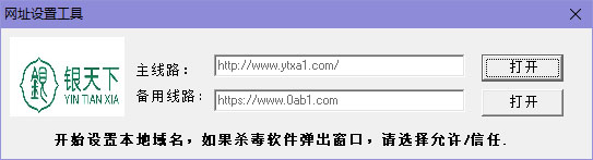 程式启动后,会显示银天下 [最新主线网络]网址及 [备用线路]网址,点击网址后面的 “打开”按钮即可打开安全准确的网址域名