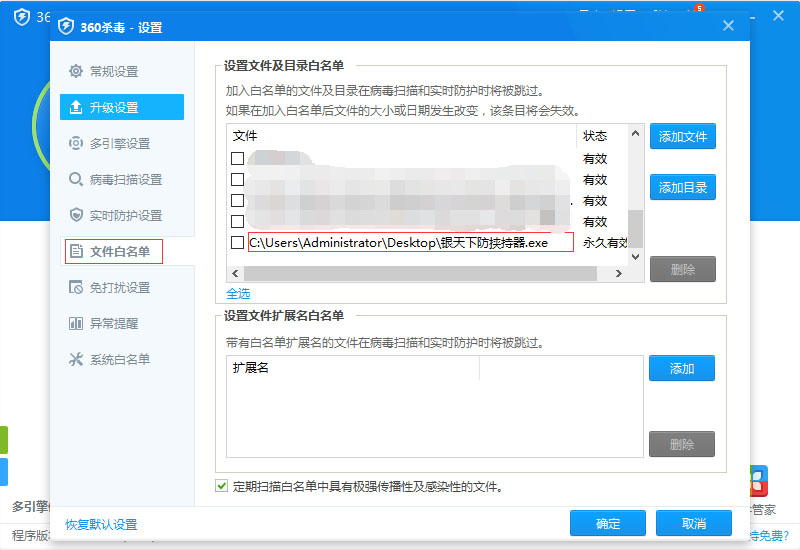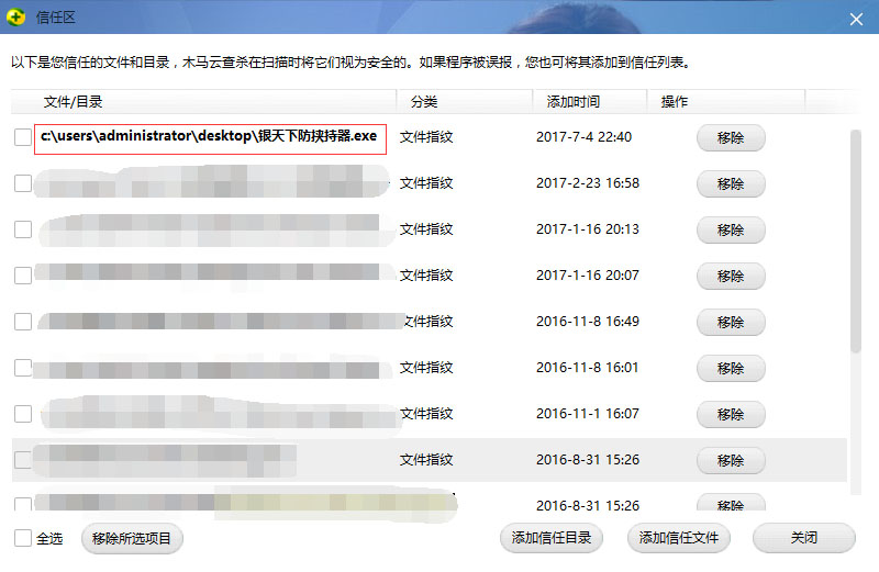 四、杀毒程式、安全卫士等 误删压缩包或EXE文件:只需将“银天下防挟持器.exe”添加进入信任列表即可,详细如下: